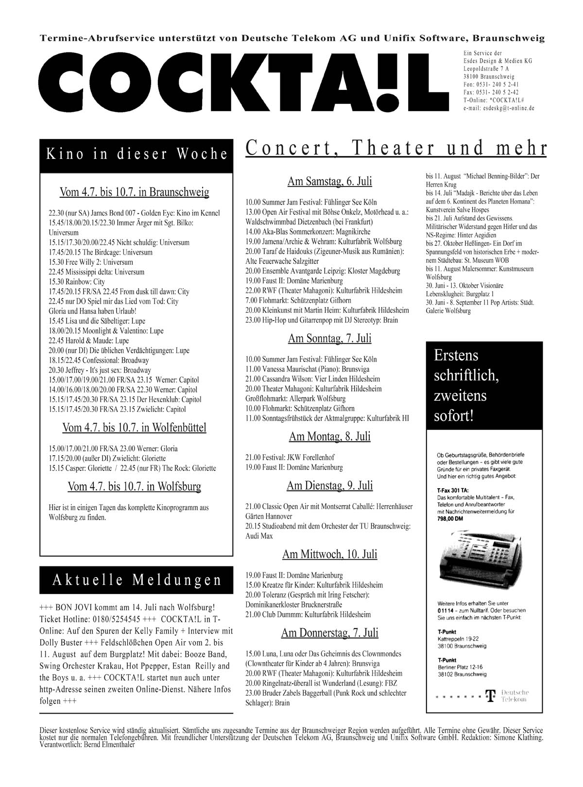 Das Stadtmagazin COCKTA!L erschien von 1990 - 2001 im Esdes Verlag. 1996 war COCKTA!L als eines der ersten gedruckten Monatsmagazine Deutschlands im Internet mit COCKTA!L Online vertreten. 1996 bot COCKTA!L den ersten Faxabrufservice mit Veranstaltungskalender in Braunschweig an. Von 2001 - 2006 erschien COCKTA!L in einem anderen Verlag und von 2007 - 2012 als Onlinemagazin bei ESDES.Media. Seit 2021 erscheint das Magazin COCKTAIL unregelmäßig als Printmagazin und E-Paper bei ESDES.Media.