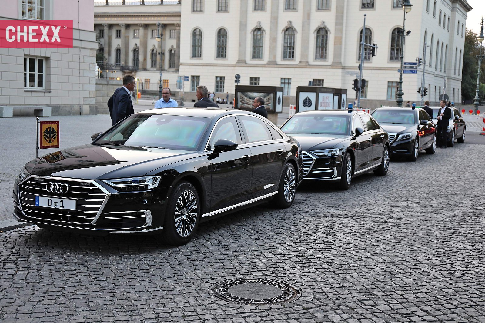 Selbst für Berliner war es eine eher seltene Möglichkeit, einen Audi mit dem Kennzeichen 0-1 und Fahrzeugstander zu fotografieren. Grund war das Festkonzert zum 450-jährigen Gründungsjubiläum der Staatskapelle Berlin in der Staatsoper am 11. September, denn Bundespräsident Steinmeier hielt dazu eine Rede.