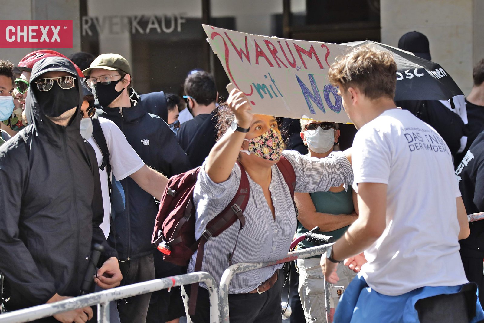Bei den Demonstrationen gegen die Corona-Maßnahmen zogen Menschen mit teils kruden Forderungen durch Berlin, die "Merkel-Diktatur" kritisierend, "Friedensvertrag" fordernd, Aluhüte und Reichsflaggen zur Schau stellend. Ohne Abstand zu wahren und sämtlich ohne Maske. Die bunte, auch aggressiv-tiefbraune, aber meist bürgerlich wirkende Mischung wurde flankiert von Gegen-Demonstrationen, vor allem in der Friedrichstraße.